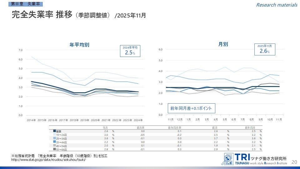 2025年11月の完全失業率(季節調整値)は2.6%となり、前月と同水準。前年同月差では0.1ポイント上昇しています。年齢階級別では、55~64歳(+0.3ポイント)のみ唯一前年同月差で上昇しました。完全失業者数は171万人で、前年同月差では7万人の増加となりました。