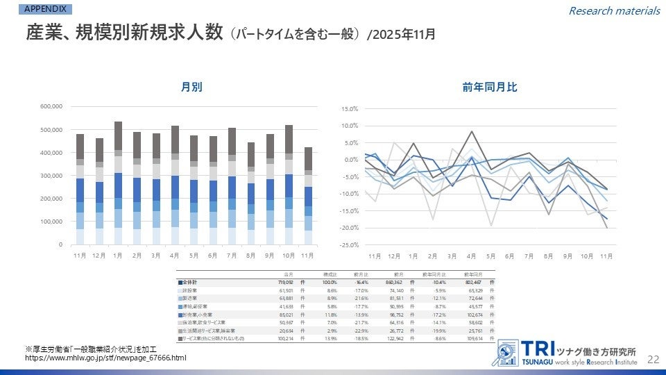 RPO(採用業務代行)・採用コンサルティングを行う株式会社ツナググループ・ホールディングス(本社:東京都中央区、代表取締役兼執行役員社長:米田 光宏)を母体とする、多様な働き方の調査研究機関「ツナグ働き方研究所(拠点:東京都港区、所長:大野 博司)」は、官公庁などが発表する労働市場関連のデータをキュレーションしつつ、分かりやすくまとめた「労働市場データレポート」を毎月発表しています。今回は12月下旬に発表された最新データをもとに2025年11月度のレポートについて、とりまとめましたのでご報告いたします。