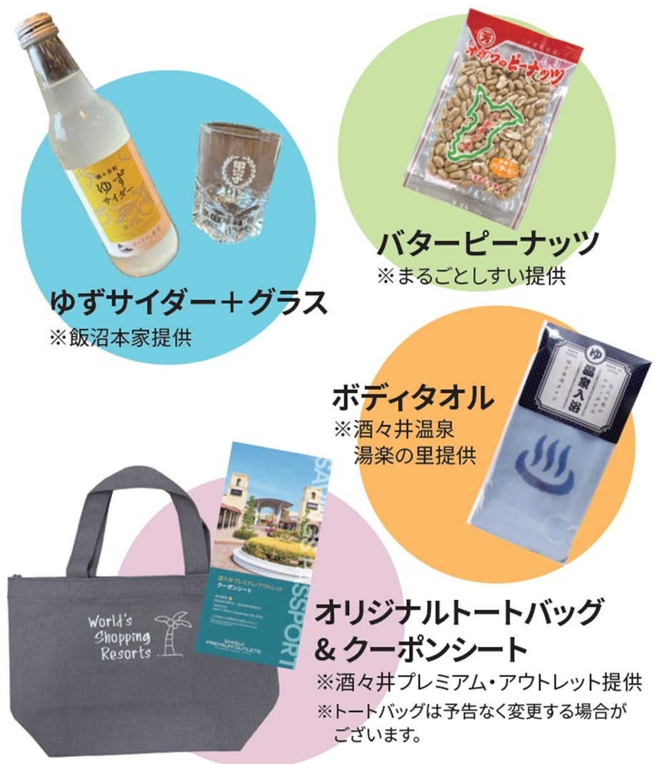 豪華賞品セット ※3 <内容> ・バターピーナッツ (まるごとしすい) ・ゆずサイダー&グラス (飯沼本家) ・ボディタオル (酒々井温泉 湯楽の里) ・オリジナルトートバッグ&クーポンシート (酒々井プレミアム・アウトレット)※4 |