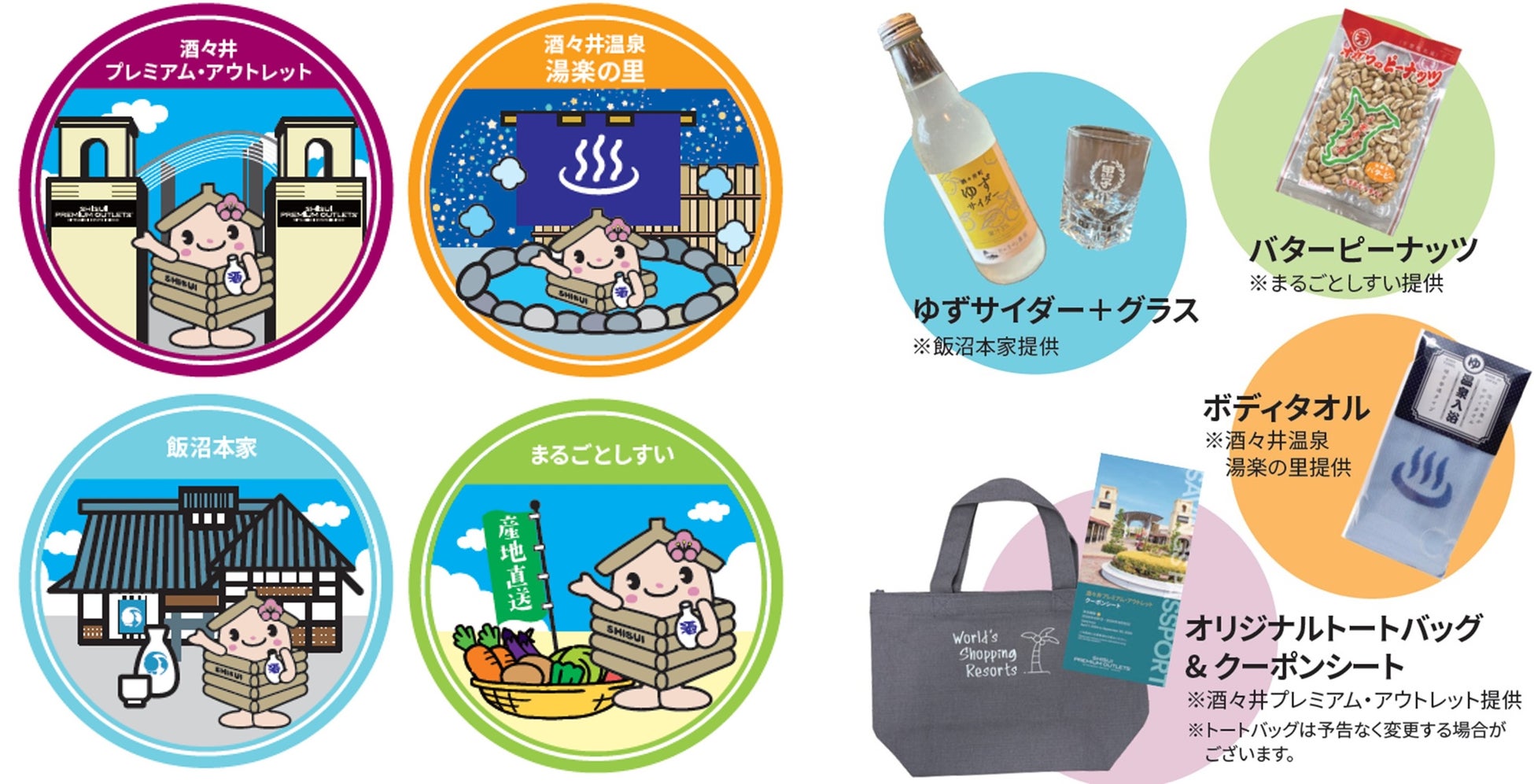 本スタンプラリーは、酒々井町のエリアの魅力を発信し、町内の観光・周遊を促進するために4施設が連携して企画したもので、2020年に初開催し、今回で2回目の開催となります。対象施設でのお買い物やご利用で、スタンプラリーの台紙に押印します。スタンプを2つ集めた方にはオリジナルステッカーをプレゼント、3つ集めると各施設のノベルティを集めた賞品セットをプレゼント。そして4つ全て集めた方には、さらに豪華な賞品セットとして、「飯沼本家」による「ゆずサイダー」や、「まるごとしすい」からは酒々井町産のピーナッツを使った「バターピーナッツ」、「酒々井温泉 湯楽の里」温泉マークのボディタオル、「酒々井プレミアム・アウトレット」の対象店舗で特典が受けられるクーポンシートなど魅力が詰まった品々をプレゼントします。