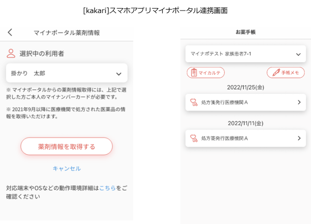 これにより、取得した薬剤・調剤情報を「kakari」のスマホアプリ内のお薬手帳にマイナポータルより自動的に取得することができるようになります。