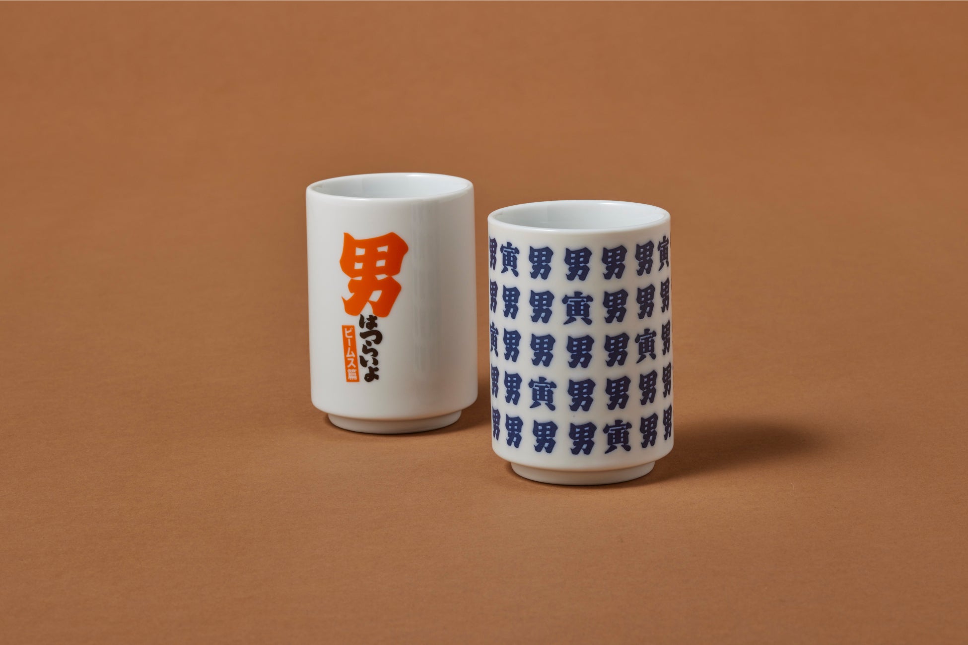 岐阜県土岐市にある、寿司湯呑を専門に製造するメーカーに製作を依頼した湯呑み。「男はつらいよ ビームス篇」のロゴを大きく配したデザインと、寿司湯呑みの定番である総柄の2つのデザイン。底面にはそれぞれ〈ビームス ジャパン〉ロゴと「男はつらいよ ビームス篇」のロゴ入り。