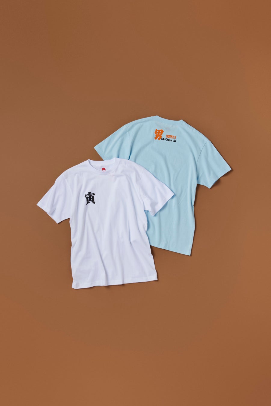 胸に“寅”文字を配置した、ワンポイントTシャツ。背面の首元には「男はつらいよ ビームス篇」のスペシャルロゴをプリント。ブルーとホワイトの2色展開。