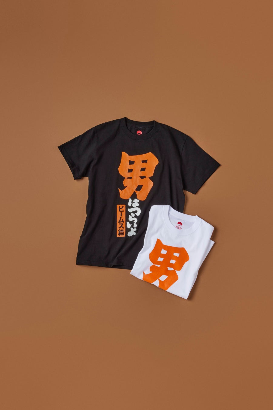 「男はつらいよ ビームス篇」のスペシャルロゴ入りTシャツ。大きく前面にロゴを配置し、背面の首元には〈ビームス ジャパン〉のロゴをプリントしたデザイン。ホワイトとブラックの2色展開。