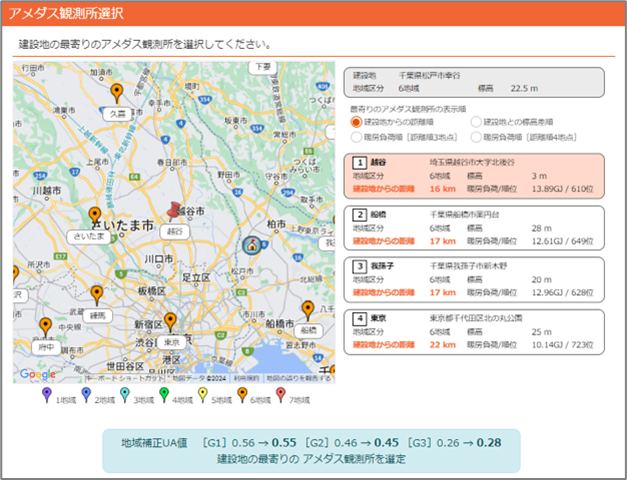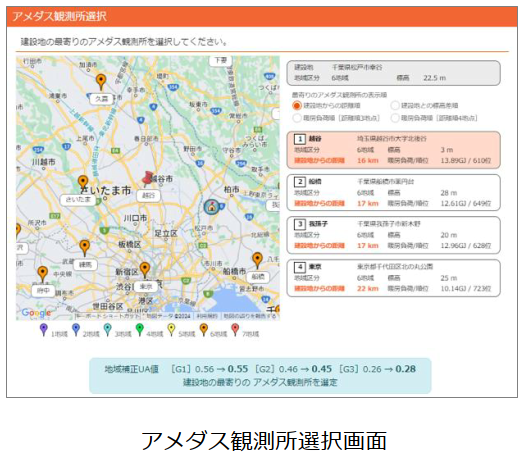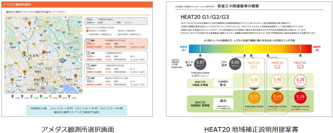 そこで、LIXILはHEAT20の地域補正を簡単にするために、建設地の住所を入力するだけで最寄りの複数のアメダス観測所を地図上にプロットし、建設地からの距離や標高差、暖房負荷も表示する技術を開発し、住宅の設計者様に無償提供している「LIXIL省エネ住宅シミュレーション」の機能として追加し、公開します。(※2)これにより、アメダス観測所を選択するだけで、地域補正された断熱性能値(※3)を一目で確認することが可能になります。また、設計している住宅の地域補正値への適合判定や、エンドユーザーさまにHEAT20や地域補正を説明するための提案書も自動で出力されますので、これまで以上に、住宅事業者様はHEAT20の家づくりに取り組みやすくなります。