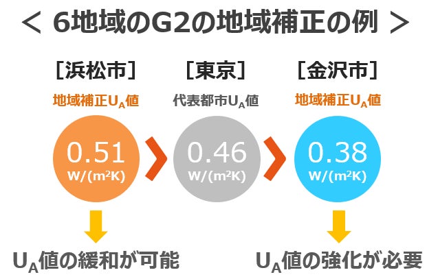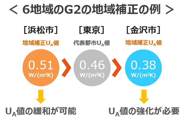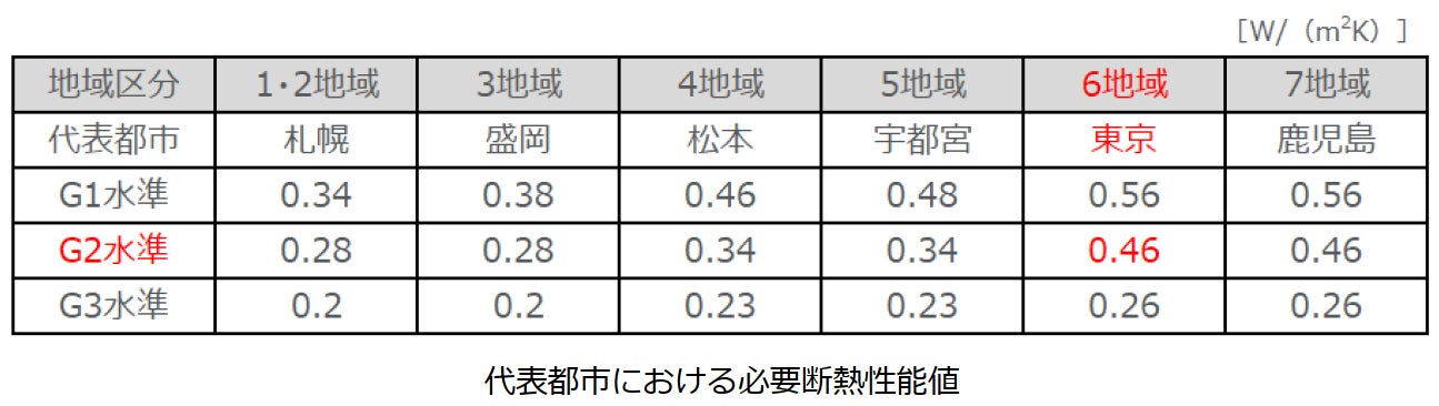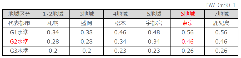 しかし、この地域補正の必要性についてはあまり周知が進んでおらず、手間も要することから、以下の表のように「東京のG2:UA=0.46W/(m2K)」等の代表都市における必要断熱性能として例示されている値が、その代表都市が所在する地域区分の全域に共通した基準値として用いられているケースが多いのが現状です。