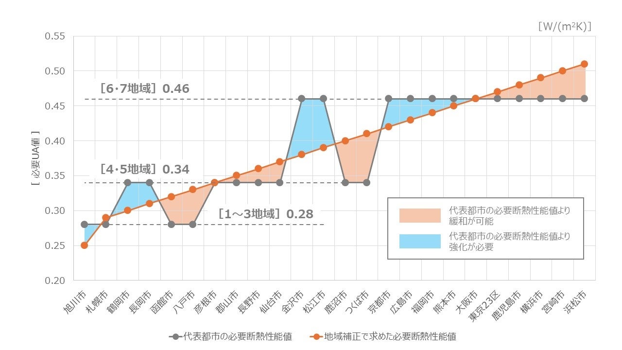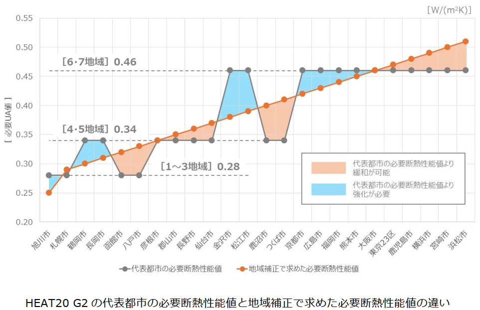 この代表都市の断熱性能値を採用した場合、代表都市よりも温暖な地域では必要性能に対してオーバースペックとなり、本来必要な断熱性能を確保するよりも余計にコストをかけていることになります。(下図の函館市・つくば市・浜松市等の地域が該当しています。)