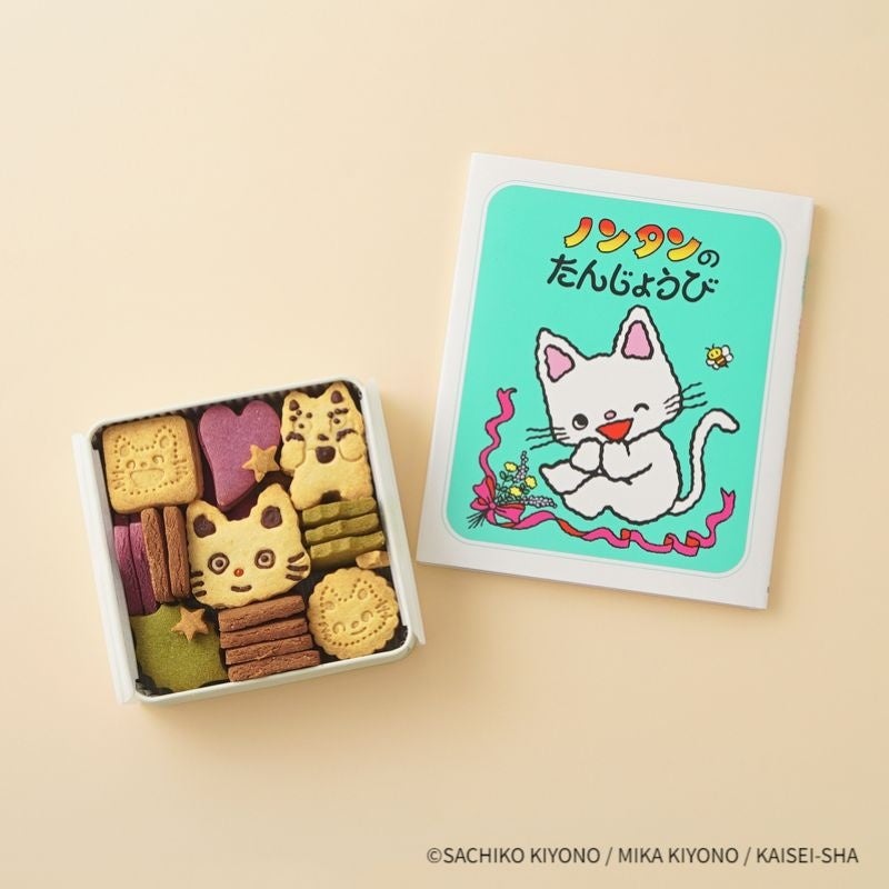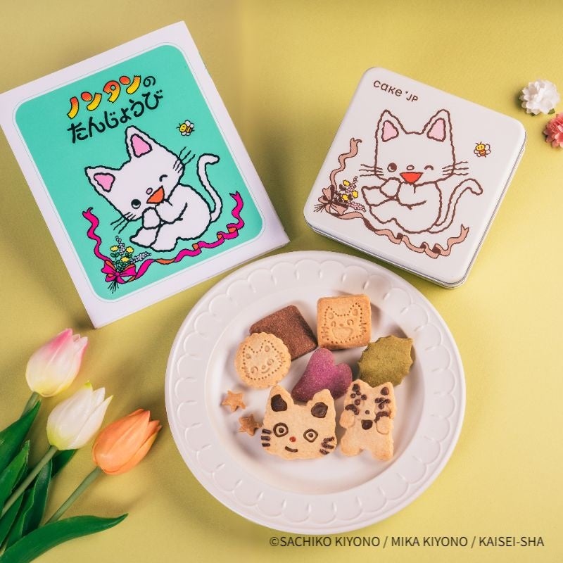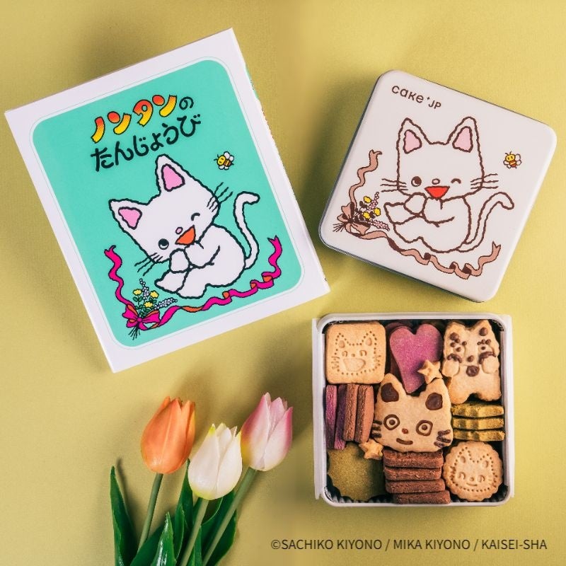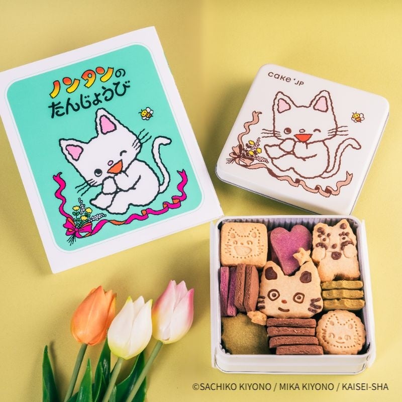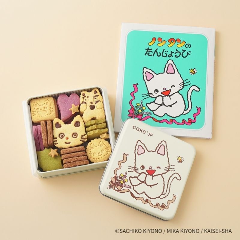 1976年の刊行以来45年以上も愛され続ける人気絵本「ノンタン」シリーズ。今回Cake.jpは、お子さまへの絵本の読み聞かせをしながら、その絵本に登場するお菓子を実際に食べることで、大人も子どももよりノンタンの世界観を楽しめる体験ができるようにという想いから、同シリーズとのコラボを実現しました。この商品は、絵本『ノンタンのたんじょうび』に登場するノンタンの友だちがノンタンのために手作りしたクッキーをそのまま再現しつめこんだクッキー缶です。缶の表面には絵本の表紙がデザインされています。