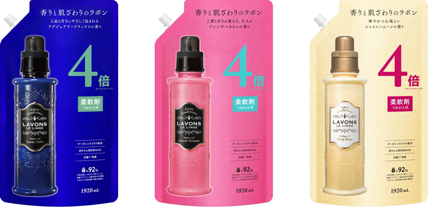 『ラボン』は、ファッションを楽しむように香りを楽しむライフスタイルを提案する、ファブリックケア&フレグランスブランドです。柔軟剤と同じ香りのオシャレ着用洗剤、ファブリックミストやルームフレグランスなど幅広いジャンルの商品を展開しています。今回は新たに、人気の柔軟剤「ラグジュアリーリラックス」「フレンチマカロン」「シャイニームーン」の大容量詰替え4倍タイプを同時に発売いたします。
