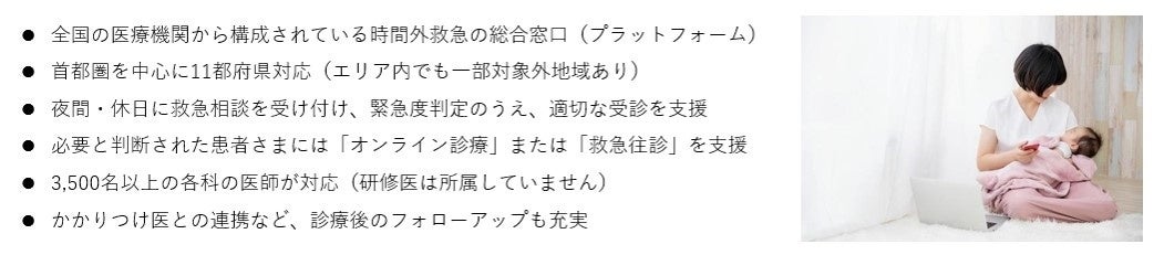 調査では約80% (※2)の家庭がかかりつけ医を持っていると答えましたが、年中無休で夜間の診療が可能なかかりつけ医はそのうちの4%に過ぎませんでした。相談もできない、自己判断もできないゆえに医療サービスの利用を控えているという現状があり、間口の広い相談窓口の整備が求められていると考えています。