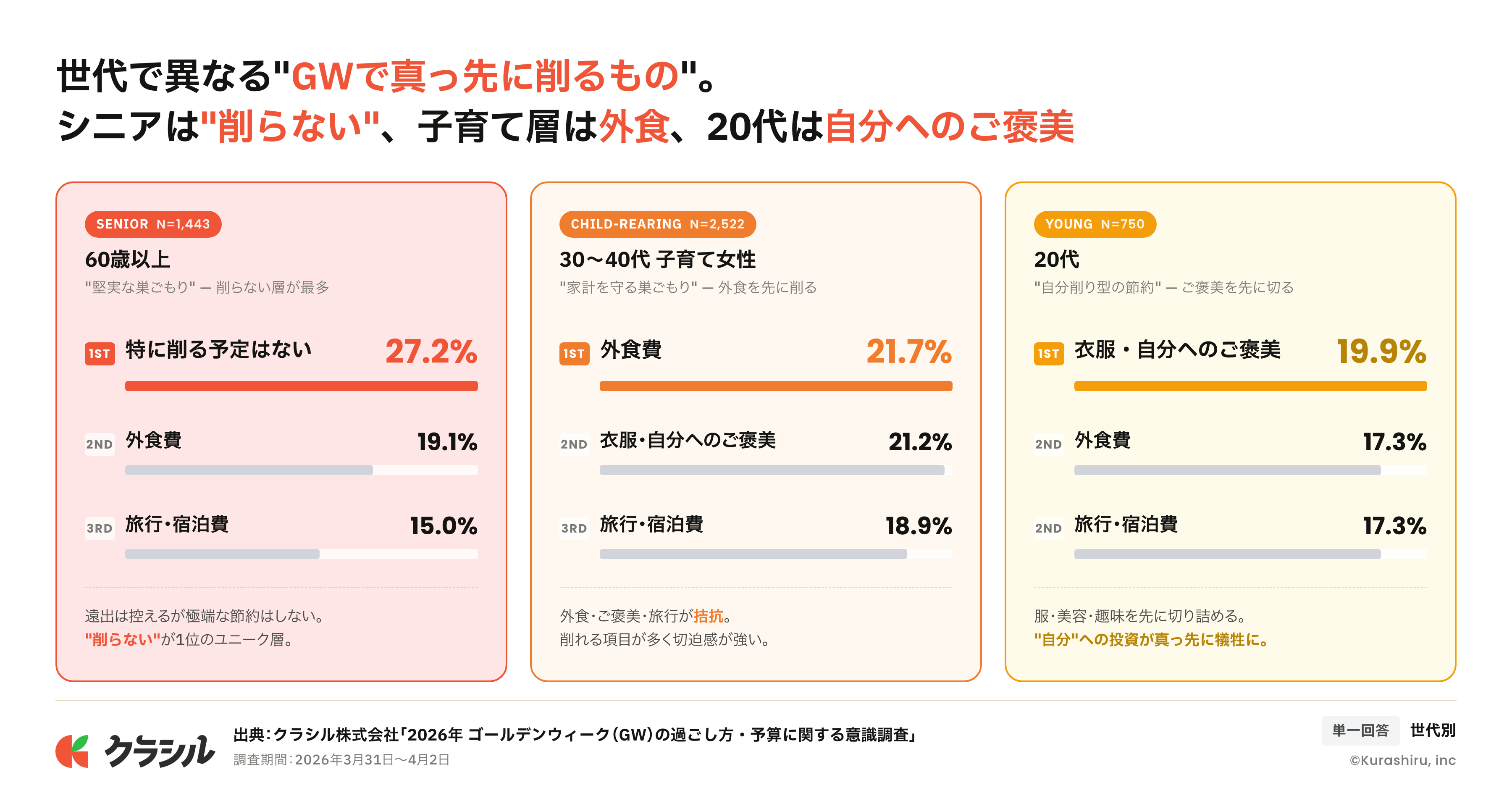 一方で、60代以上の層に「真っ先に削る予算」を聞いたところ、「特に削る予定はない」が27.2%と最多になりました(30〜40代子育て層の「特に削る予定はない」13.9%の約2倍)。遠出は控えるものの、日々の食卓などにおいて極端な節約はせず、マイペースに自宅での連休を過ごすシニアならではの「堅実な巣ごもり」の様相が見て取れます。