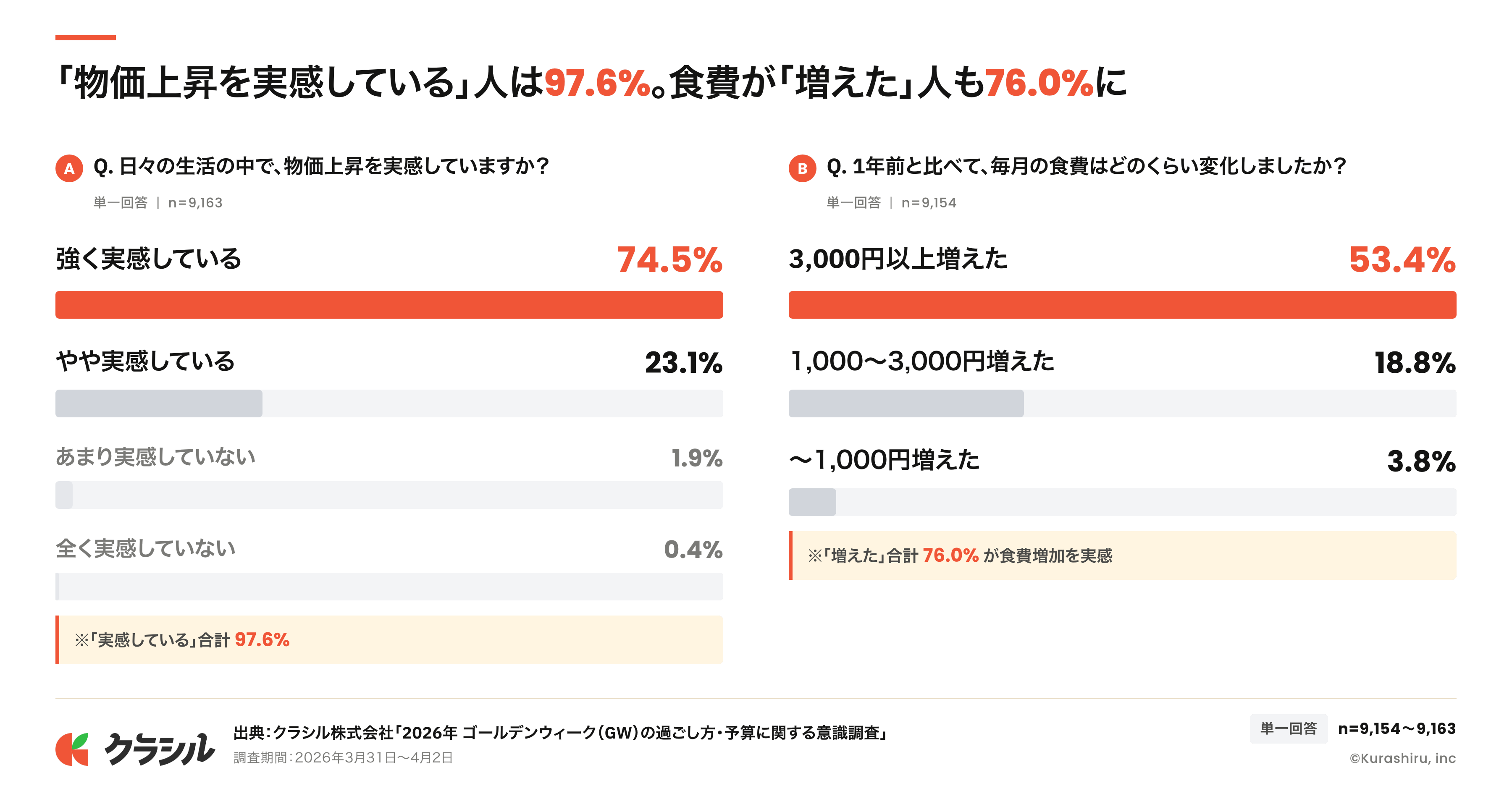 全体の97.6%が日々の生活の中での物価上昇を実感。1年前より食費が「増えた」と回答した人は76.0%(うち「月3,000円以上増えた」が53.4%)にのぼります。