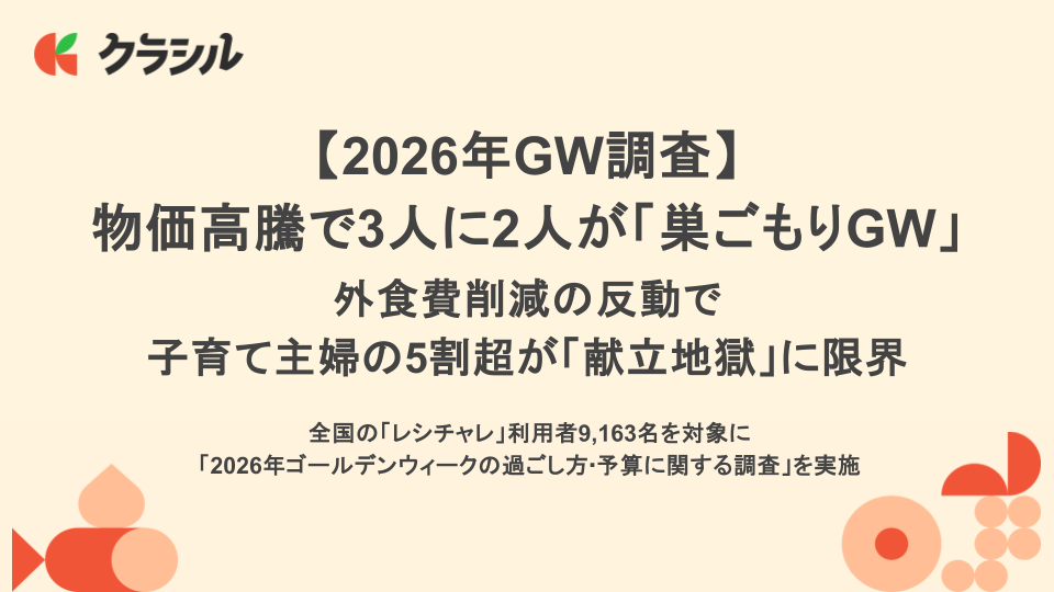 クラシル株式会社(本社:東京都港区、代表取締役社長:堀江 裕介、以下「クラシル」)が運営する節約アプリ「レシチャレ」は、全国の「レシチャレ」利用者9,163名を対象に「2026年ゴールデンウィークの過ごし方・予算に関する調査」を実施しました。