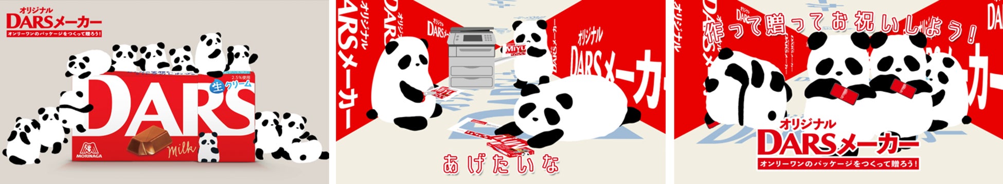 「オリジナルDARSメーカー」特設サイトの公開に合わせ、ダースの妖精であるPANDARSが動画で使い方を紹介します。動画ではダースのTVCMでも使われている童謡「森のくまさん」のメロディーにのせたオリジナルの歌詞で、「オリジナルDARSメーカー」の利用機会を伝えています。〈誕生日 篇〉〈ありがとう 篇〉〈お疲れ様 篇〉が公開され、可愛らしいPANDARSのダンスにも注目です。