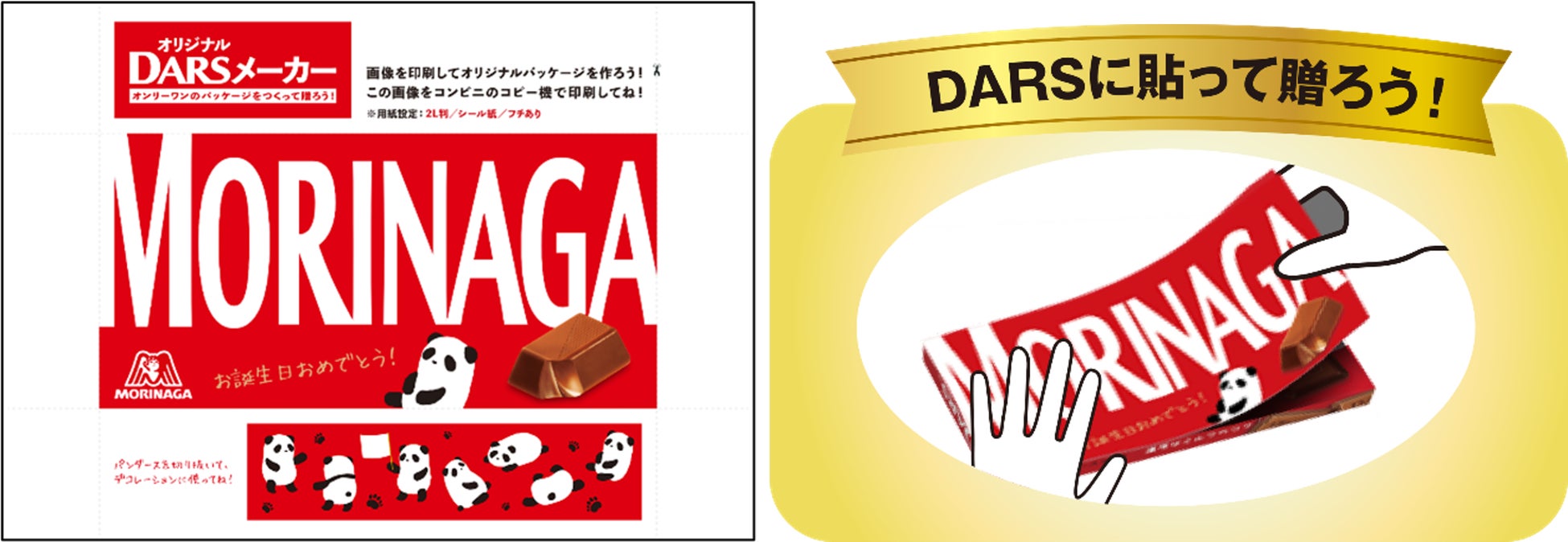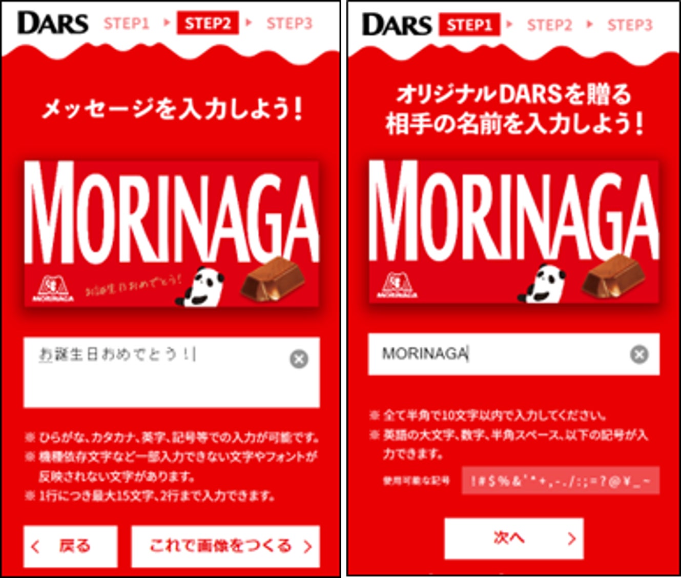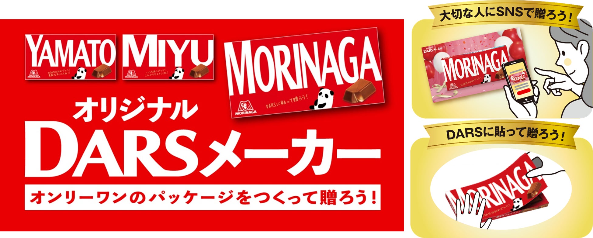 特設サイトでは、「ダース」の特徴でもある赤いパッケージに自分の名前や大切な人の名前を自由に英字で入力すると、「ダース」のロゴ風に変換されます。さらに、30文字以内でメッセージ入力をすることで、オリジナルの「ダース」画像が完成します。作成した画像はSNSで贈ったりすることができ、コンビニエンスストアなどのプリンターで印刷して「ダース」に貼れば世界にひとつだけのオリジナル「ダース」が完成します。「オリジナルDARSメーカー」でお客様が自分自身の想いを形にし、大切な人に贈ることで笑顔の輪が広がることを願い企画しました。「ダース」は「みんなの笑顔も、ミルクのしわざ。」をキーメッセージに、商品だけでなく様々な企画を通じて、お客様に笑顔を届けてまいります。