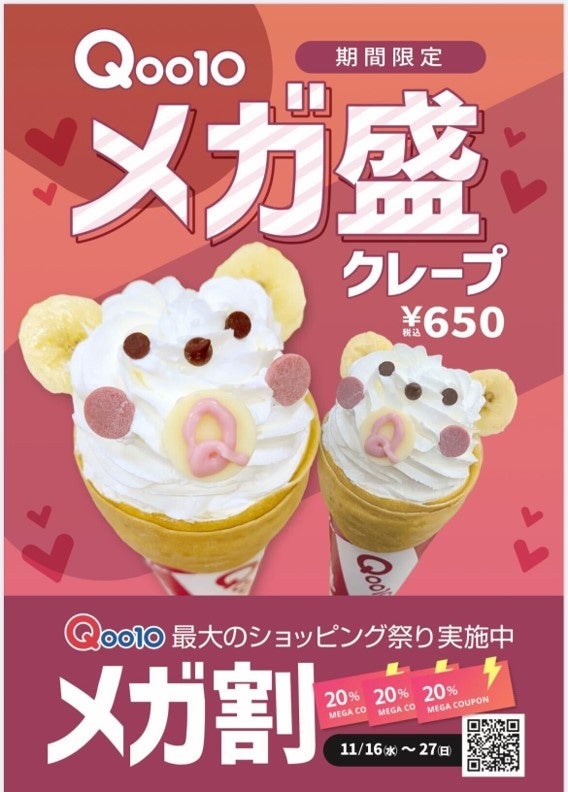 コラボ期間中、店舗でクレープを購入いただいた方には、Qoo10メガ盛クレープを撮影した写真に指定のハッシュタグをつけてSNSで投稿すると、抽選で10名様に1,000円分のQoo10ギフト券が当たるキャンペーンも開催いたします。メガ盛で美味しく、さらにお得なギフト券まで当たるかもしれない楽しさ満載のキャンペーンをぜひお楽しみください。