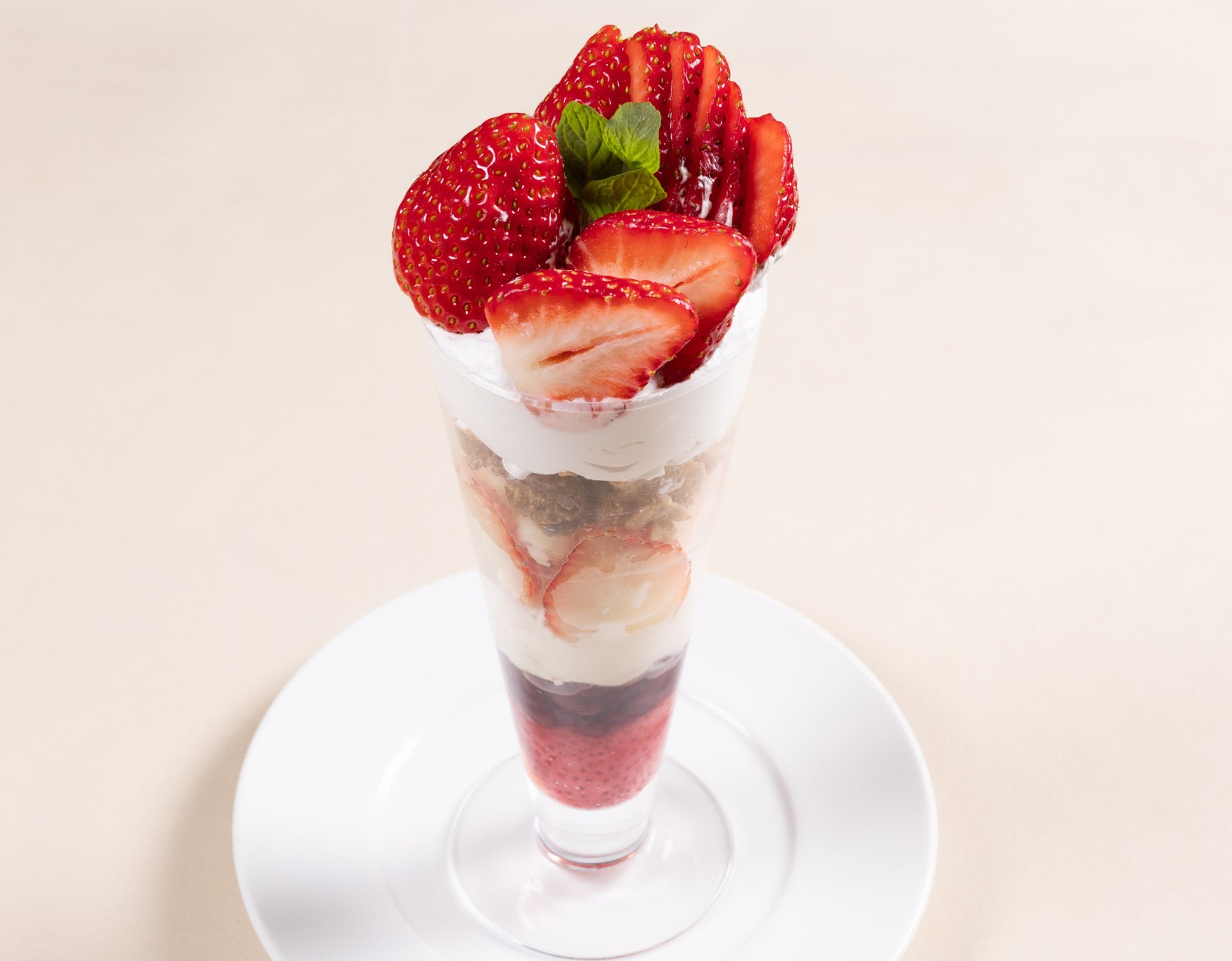 晴苺を贅沢に使用したボリューミーなパフェ。見た目の美しさも楽しめます。生クリームやあずき、クリームチーズヨーグルトなど、さまざまな素材とのマリアージュをご堪能ください。