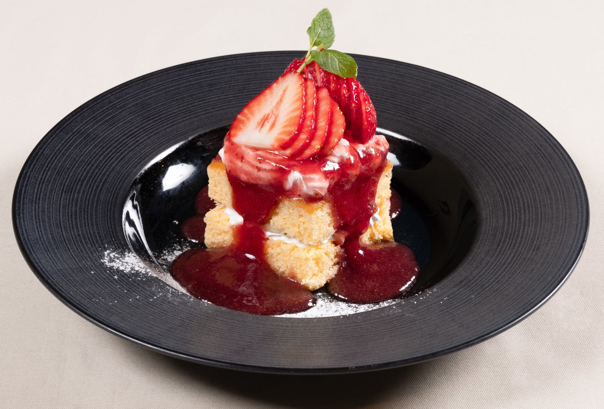 スライスされた晴苺をふんだんに乗せた贅沢ケーキ。たっぷりとかけられた晴苺のソースがスポンジに染み込んでいるため、最後の一口まで濃厚な味わいが楽しめます。