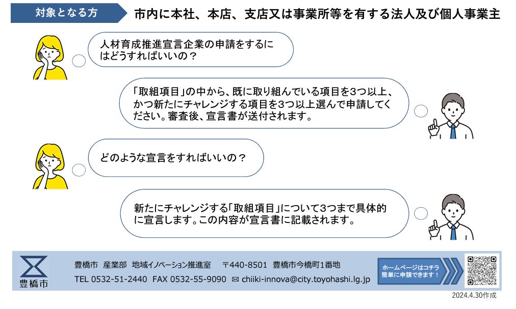 市ホームページ(https://www.city.toyohashi.lg.jp/58241.htm)より申請してください。その後、内容を確認し、「⼈材育成推進宣⾔企業」として市のHPで公表します。