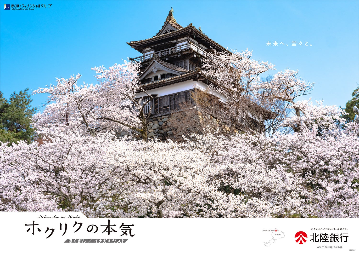 今回は、春に新幹線が延伸される福井県の「足羽川」と「丸岡城」をポスターにいたしました。自転車と対比されることで何キロも続く桜並木のスケールの大きさが伝わってくる作品と、貴重な現存天守が桜の上に浮いているような光景が印象的な作品です。