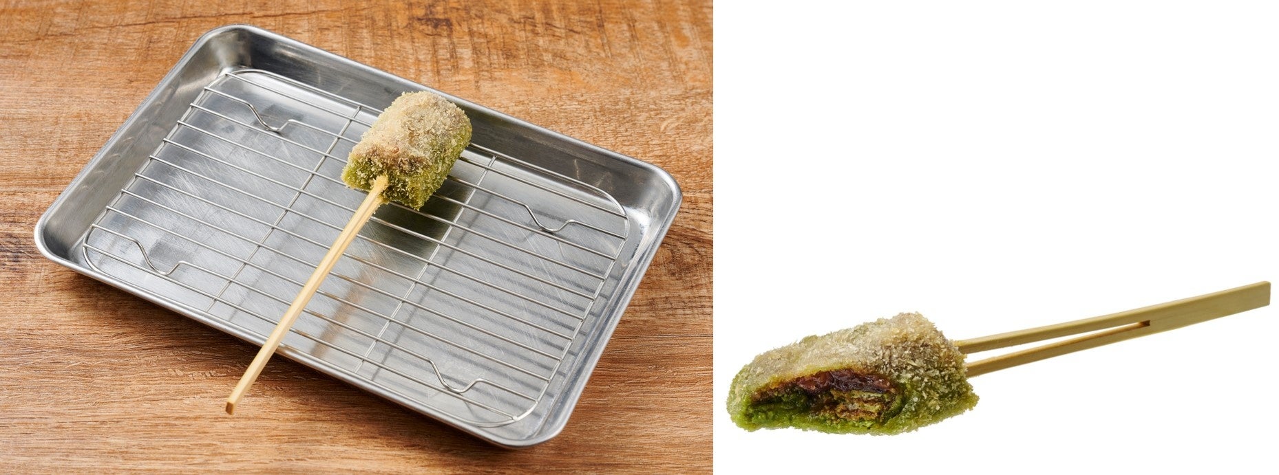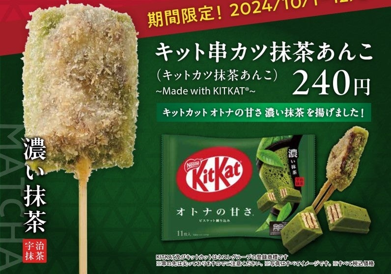本格抹茶の深い苦みや香り、旨味が楽しめる「キットカット オトナの甘さ 濃い抹茶」に相性抜群のあんこを乗せて揚げちゃいました!!このコラボでしか味わえない、日本に生まれてよかったと感じられるオトナスイーツ串カツをぜひお楽しみください!