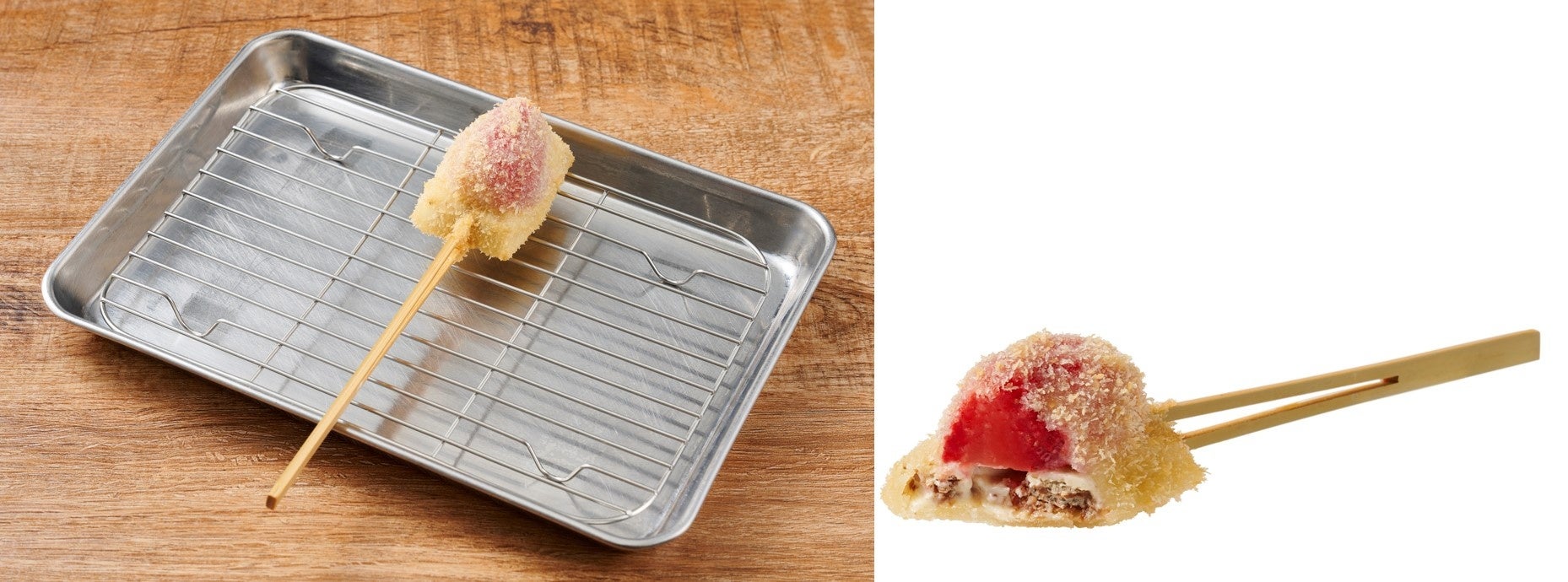 砕いたフィアンティーヌを練りこんだ生地とサクッサク食感のウエハースが特長の「キットカット オトナの甘さ ホワイト」に冷たいいちごを乗せて揚げちゃいました!酸味と甘みのバランスが絶妙で、今までにないタルトのような新食感オトナスイーツ串カツをぜひお楽しみください。