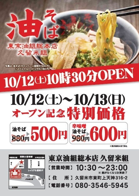「東京油組総本店 久留米組」 オープン記念特別価格でご提供!