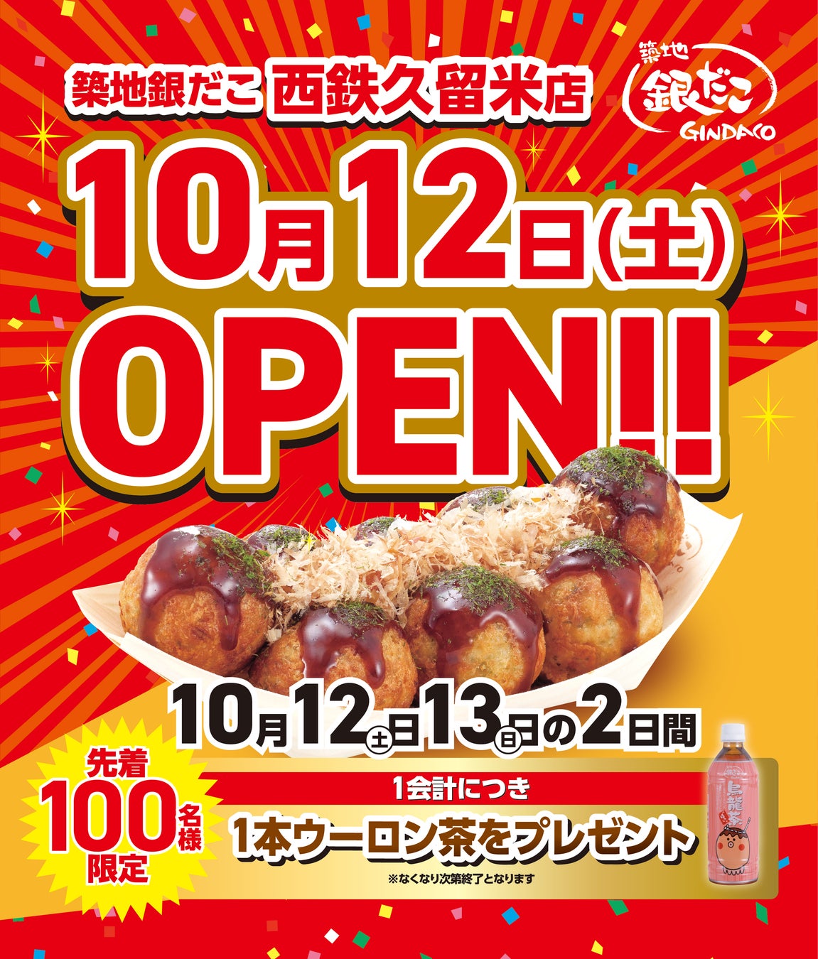 実施期間:2024年10月12日(土)、13日(日)の2日間 ※各日先着100名様へ1会計、築地銀だこオリジナル烏龍茶1本をプレゼント