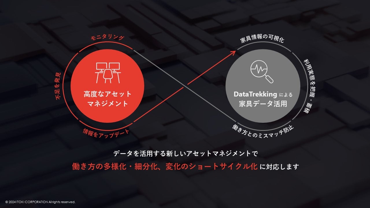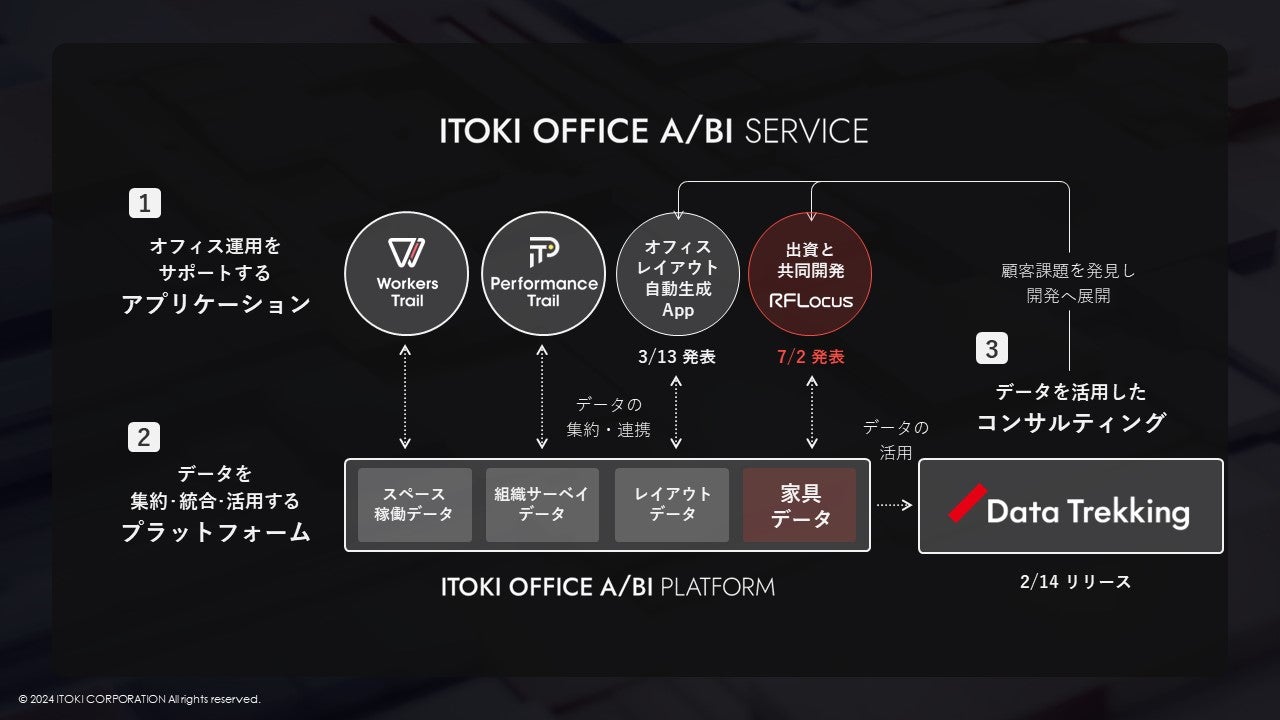 当社はワークプレイス事業において、Office1.0をオフィス家具の製造・販売、Office2.0を空間ベースのソリューション提供ビジネス、Office3.0をデータ活用による働き方ベースのオフィスDXと捉えビジネスを展開しています。2024年2月にはオフィスデータを活用したコンサルティングサービス「Data Trekking」をローンチ。同年3月にはAIスタートアップ企業と「オフィスデザイン自動生成AIサービス(仮称)」の開発をスタートし、競争優位性の高いOffice3.0領域に力を入れています。
