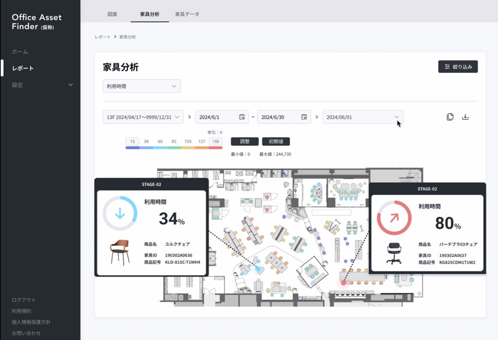 さらに、位置特定技術を活用し、イトーキの持つ製品情報など家具のデータベースと連携させることで家具の所在を迅速に把握できるアプリケーション「Office Asset Finder(仮称)」を開発します。これにより、従来の什器・備品管理やリニューアル計画時に膨大な工数と時間を費やしていた、オフィス家具などのアナログな棚卸作業を大幅に軽減し、高度なアセットマネジメントをサポートする新サービスの実現を目指します。