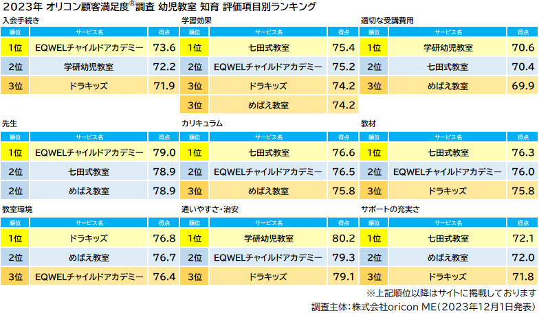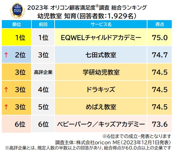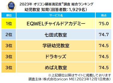 2023年 満足度の高い『幼児教室 知育』ランキング |【EQWELチャイルドアカデミー】が3年連続総合1位 評価項目別「入会手続き」「先生」では2年連続1位(オリコン顧客満足度調査)