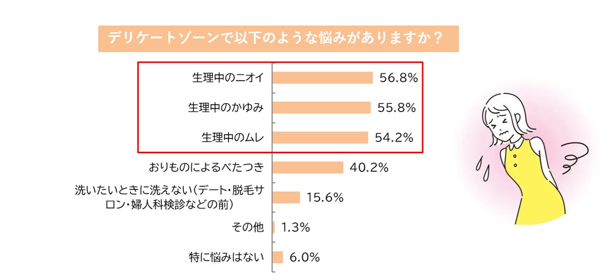 ピップの調査によると、20代~40代女性のデリケートゾーンの悩みは「生理」のニオイやかゆみ、ムレが50%を超えていることが判明しました。