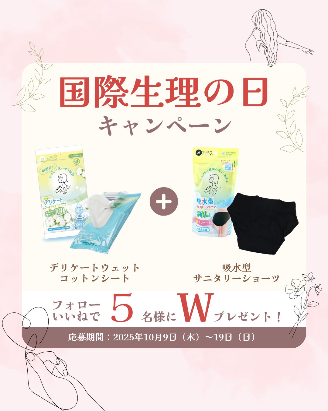国際生理の日にちなんで、10月9日(木)より公式Instagramでは抽選で5名の方に「吸水型サニタリーショーツ」「デリケートウェットコットンシート」をプレゼントするキャンペーンを実施いたします。