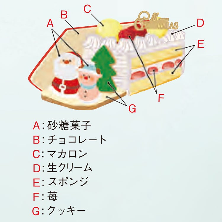 ロマンスカーに乗ったサンタクロースと雪だるまが街のみんなにプレゼントを配達する様子をイメージした、夢いっぱいのクリスマスケーキ。反対側にはVSEがデザインされています。ショートケーキ本体と4つのチョコパーツを、自分で組み立ててデコレーションを完成させます。