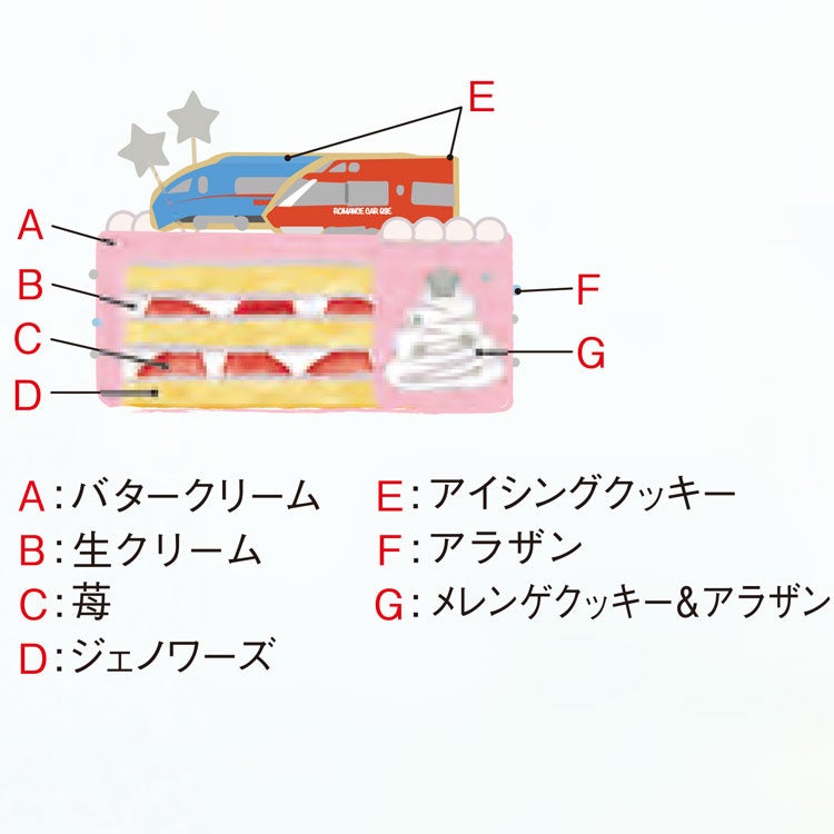ピンクのロマンチックな空を2台のロマンスカーが仲良く駆け抜けるクリスマスケーキ。たっぷりの苺とバタークリームの優しい甘さで笑顔も運びます。