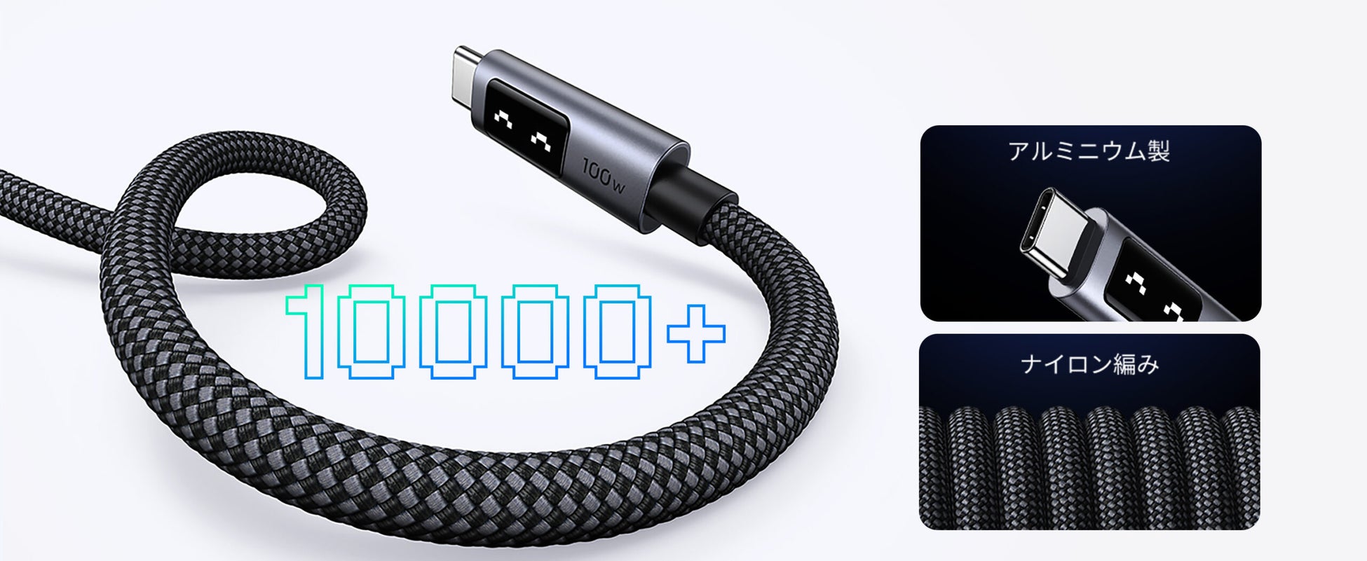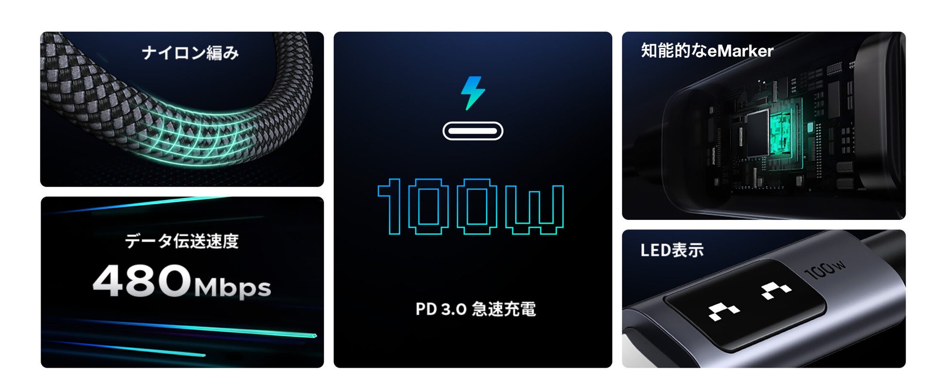 最大出力100Wの急速充電機能を搭載。カワイイ見た目からは想像できないパワーを持った実力派のケーブルです。eMarkerを搭載し、スマートな充電を実現。480Mbpsのデータ伝送にも対応しています。