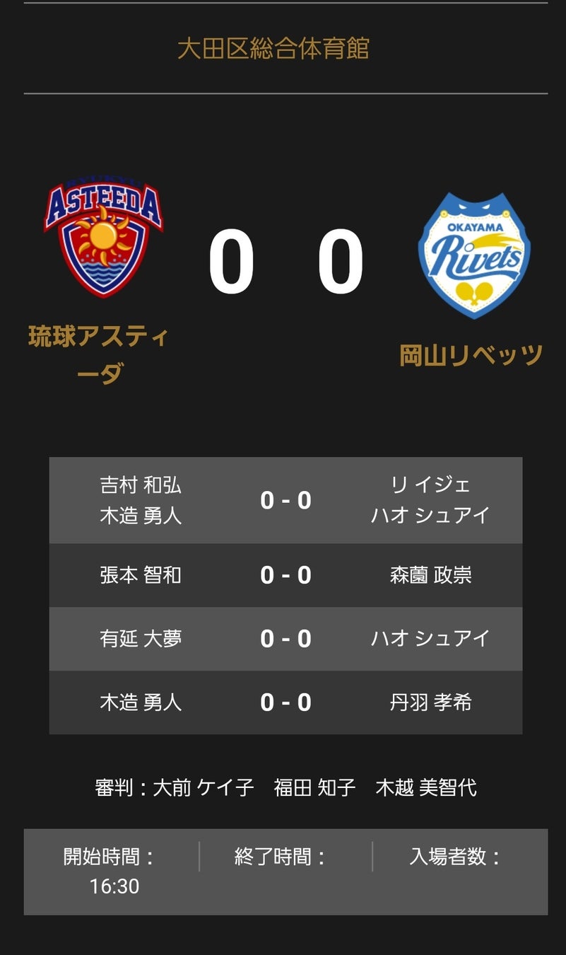 ノジマTリーグ 2022-2023シーズン 公式戦 9月11日開催 琉球アスティーダ vs 岡山リベッツ オーダー発表