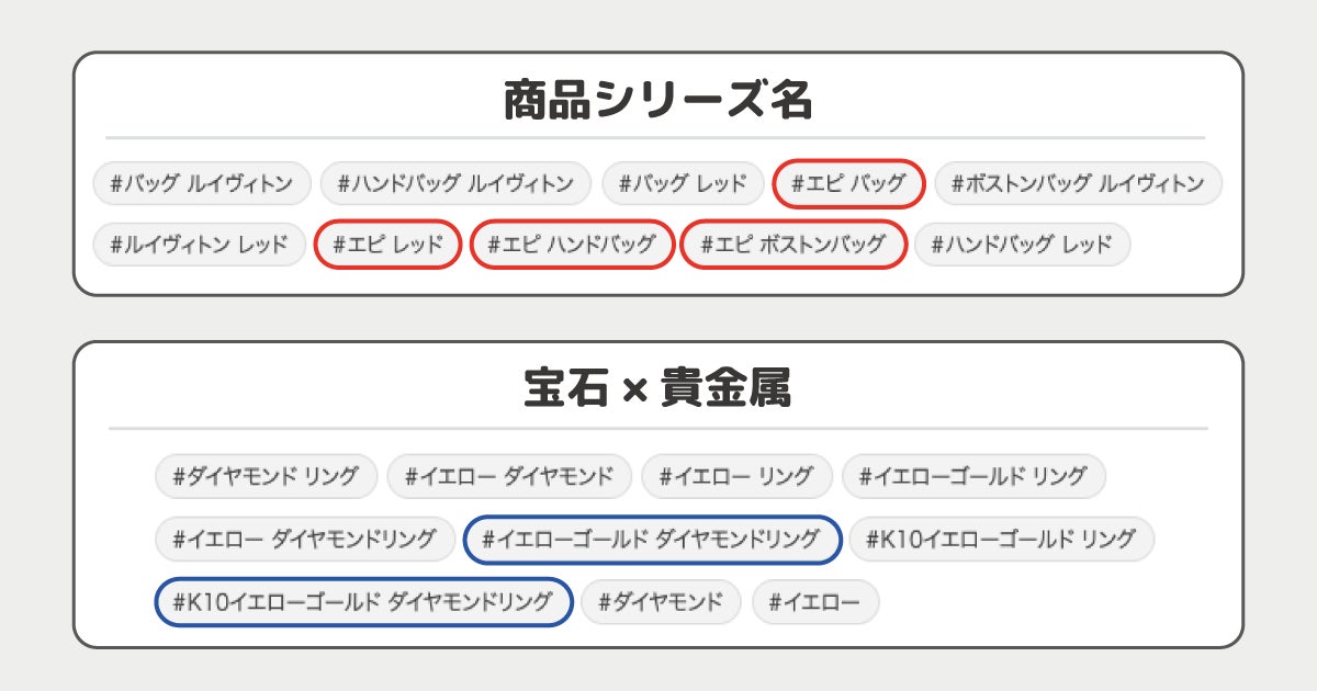 「商品のシリーズ名」や「貴金属と宝石の組み合わせ」など有用的なハッシュタグを生成し、検索結果ページや商品詳細ページに表示できるようになりました。ユーザーは目的の商品をスムースかつ効率的に見つけることが可能になるため、離脱率の低下や検索体験の向上に繋がります。