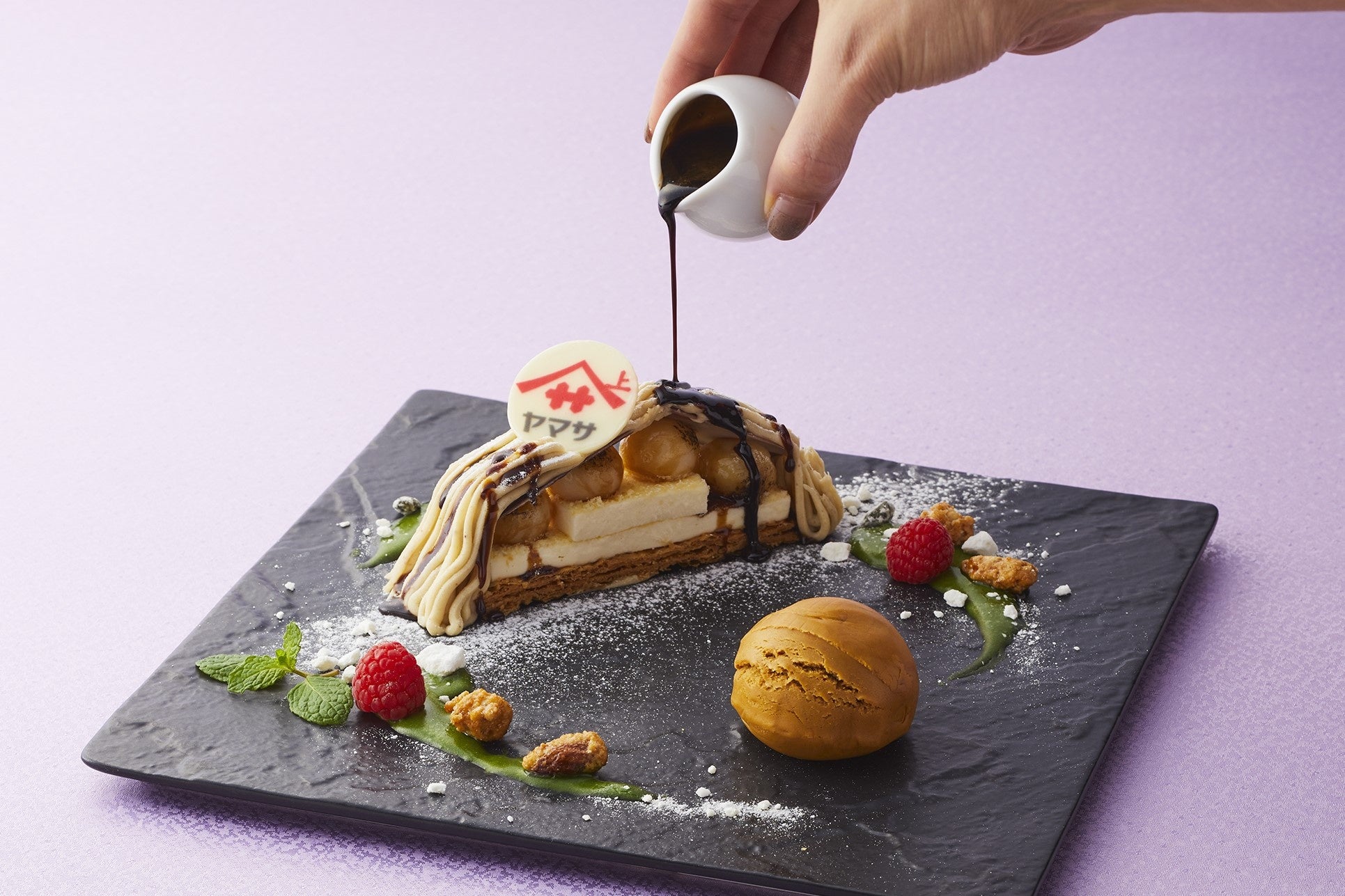 「フォンテーヌ」では、ヤマサ醤油のロゴマークをイメージした山型の和栗モンブランにみたらし団子を合わせた「みたらしモンブラン メープルしょうゆアイス」をご用意。なめらかでコク深く、甘味・苦味・酸味のバランスが絶妙な味わいの“黒蜜風しょうゆ”をお楽しみいただけるよう、白玉に“黒蜜風しょうゆ”を塗って炙ったほか、相性のよいメープルアイスにも“黒蜜風しょうゆ”を入れて風味豊かに仕上げました。