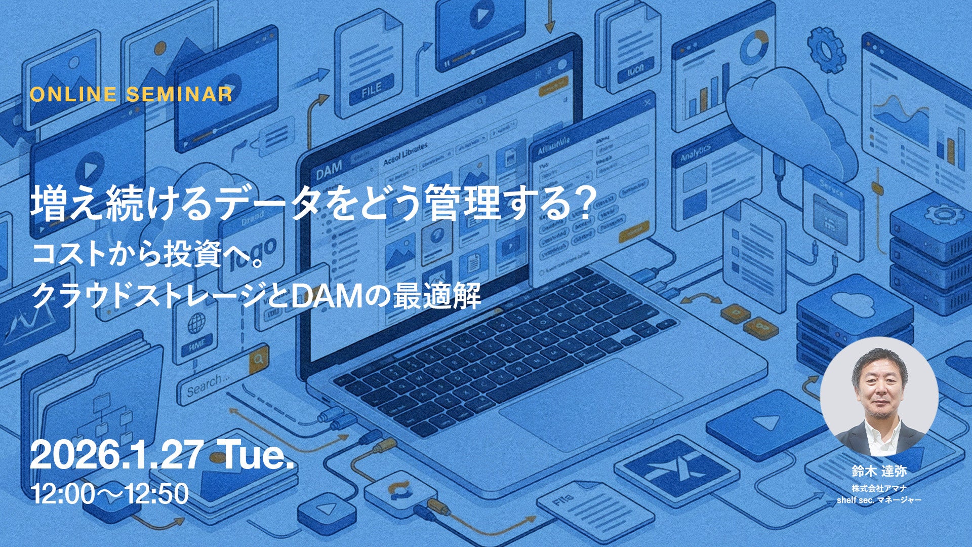 コミュニケーション変革をクリエイティブで実現する株式会社アマナ(本社:東京都品川区、代表取締役社長:金子剛章、以下「アマナ」)は、2026年1月27日(火)、「増え続けるデータをどう管理する? コストから投資へ。クラウドストレージとDAMの最適解」をテーマにオンラインセミナーを開催します。
