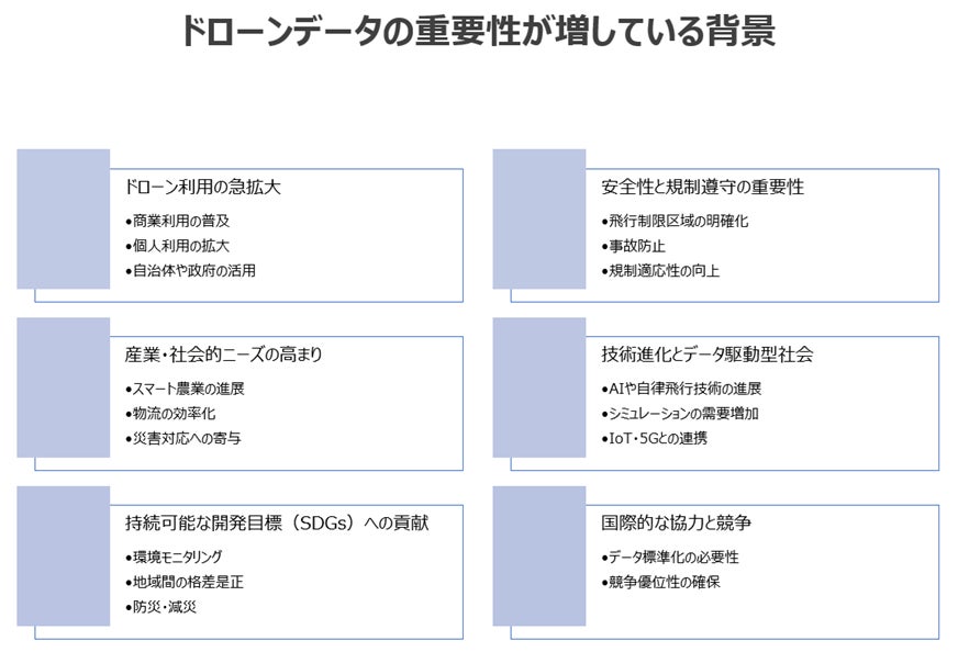 これらのオープンデータは、ドローンの効率的かつ安全な運用を支えるだけでなく、新しい市場や技術革新の基盤としても重要です。