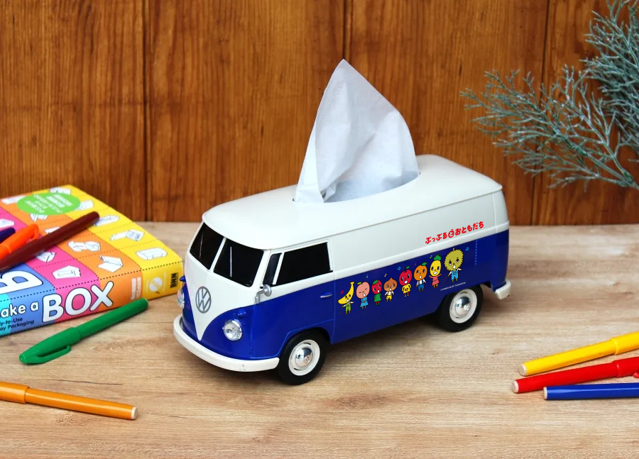 バスは、VolkswagenのT1クラシックバス。「レトロ」のアイコン的存在でもあるクラシックカーで、特徴的な見た目は今もなお多くの人から愛されています。そんなバスを細部まで再現したディティールで、タイヤも回る遊び心たっぷりのティッシュケースです。