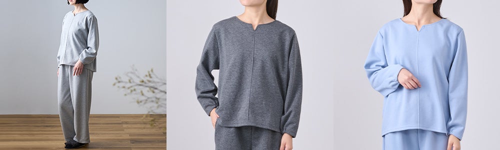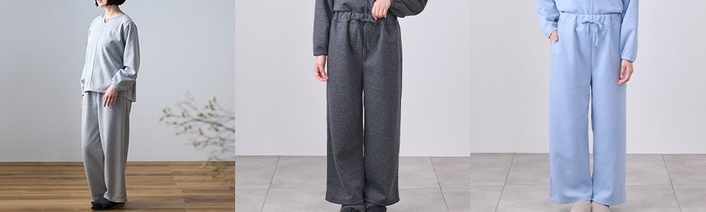 ダンボールニット生地でありながら、パターンやシルエットにこだわることで、キチンと見えするので急な来客でも安心です。素材には綿混を使用し、心地もよい肌触りに仕上げました。ちょっとした来客や外出にはもちろん、リラックスタイムも快適にお過ごしいただけます。生地には静電気軽減の後加工を施しているので、これからの季節にぴったりです。