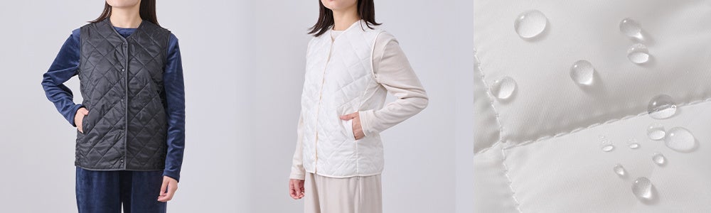 着ていることを忘れてしまうほどの軽さと快適さ小さくたたんで持ち運びも楽々の「撥水キルトベスト」「撥水キルトベストワンピース」が登場
