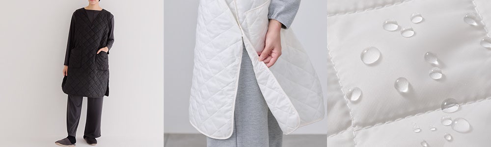 KEYUCAの「ケユカリラックスウェア 撥水キルトベスト」「ケユカリラックスウェア 撥水キルトベストワンピース」で快適なおうち時間をお過ごしください。