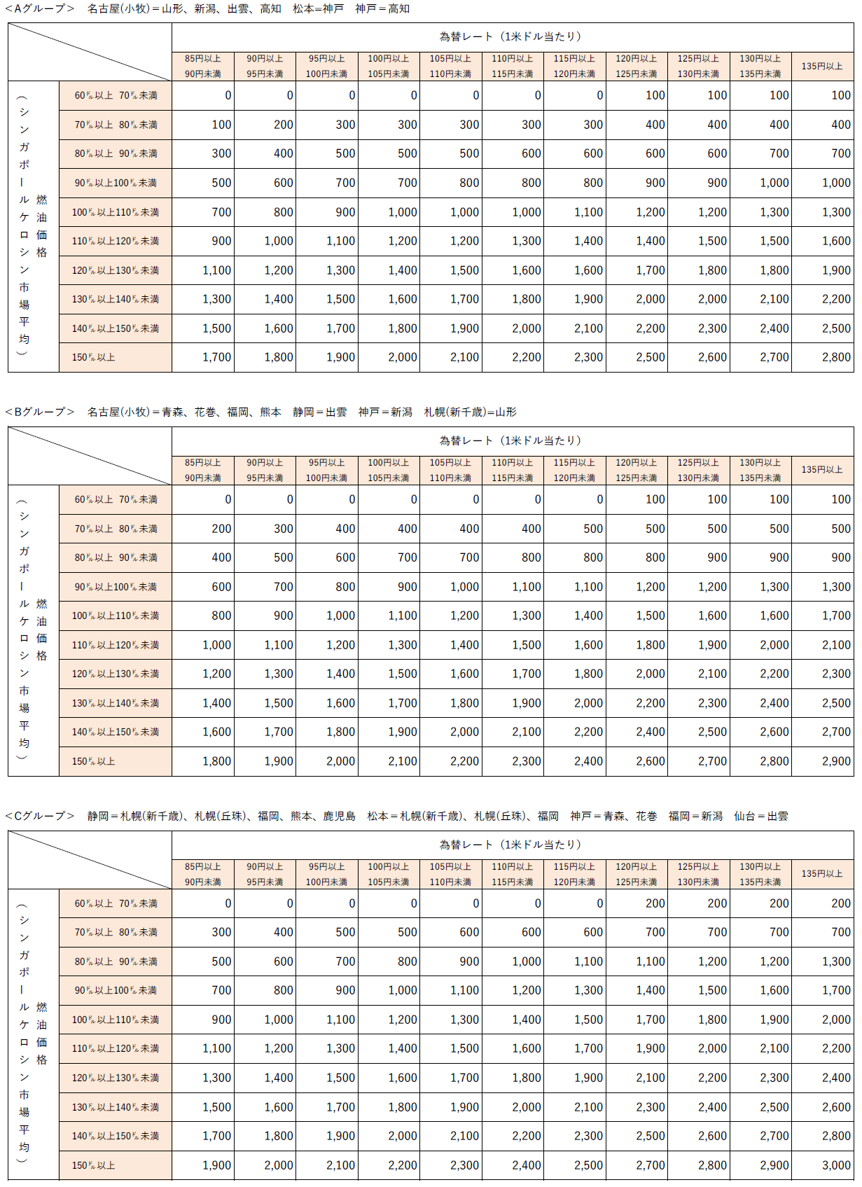 2022年10月発券分につきましては、2022年8月のシンガポールケロシン市況価格平均が1バレル当たり133.3米ドル、為替レートが1米ドル当たり135.2円であったことから、以下の金額を適用させていただきます。