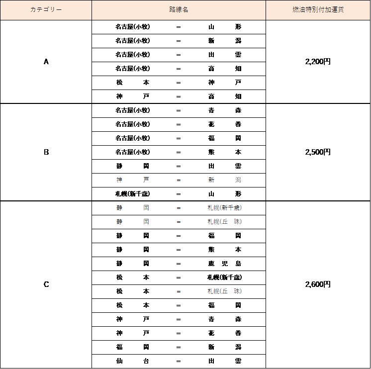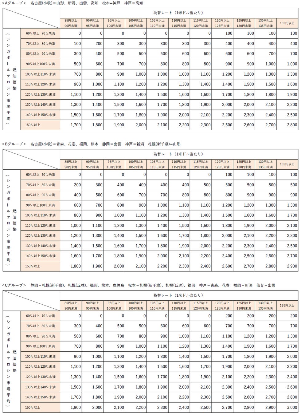 なお、燃油特別付加運賃は、シンガポールケロシン市況価格および為替レートの変動に応じて、1ヶ月毎に見直しております。