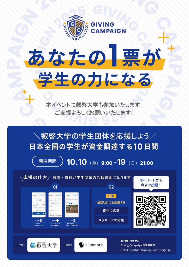 叡啓大学(学長:有信睦弘、広島市中区)は、2025年10月10日~10月19日までの10日間、本学の学生団体を応援するオンラインチャリティーイベント「Eikei University of Hiroshima Giving Campaign 2025」を開催します。