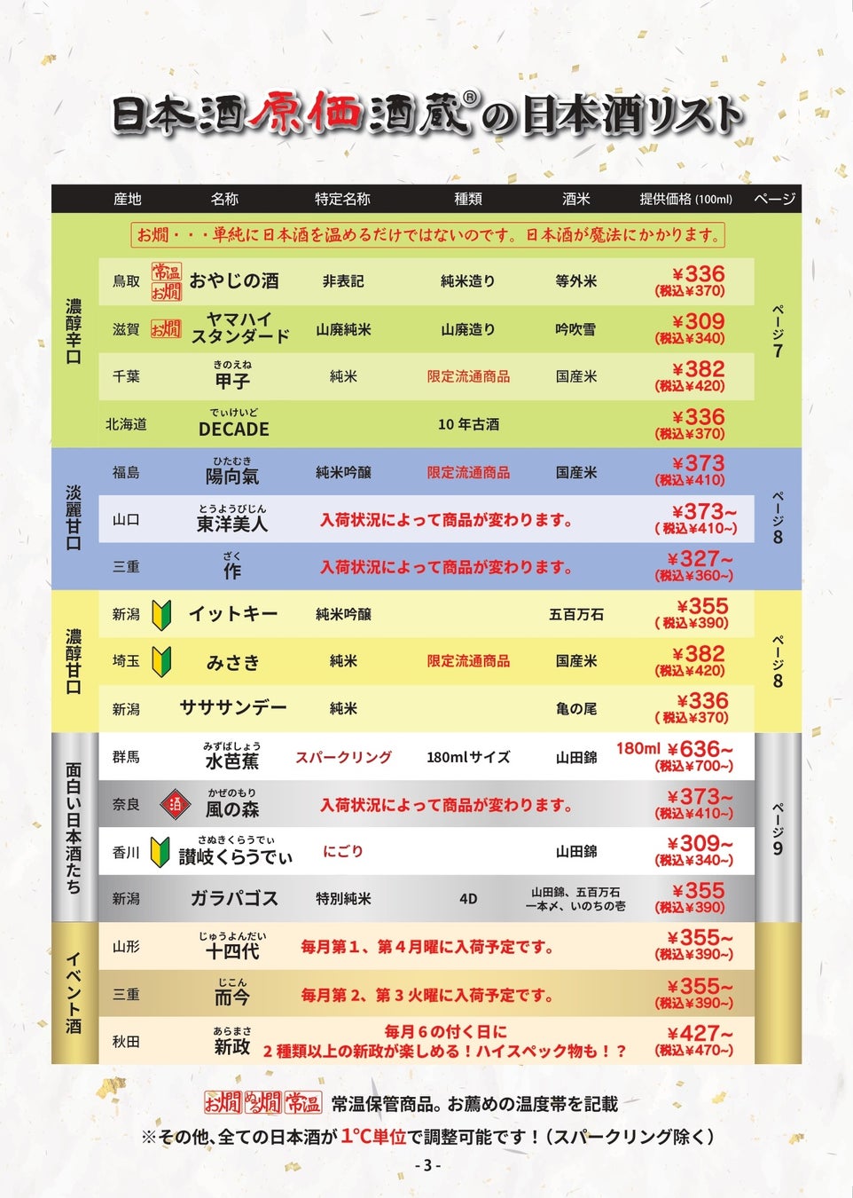 ※上記メニューの他に各店限定日本酒を10〜15種ほどご用意いたします。