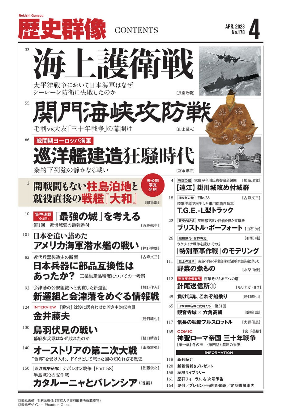 新たに見つかった戦艦「大和」の未公開写真を掲載! 日本海軍の海上護衛戦、毛利vs大友の関門海峡攻防戦ほか、歴史好きの方必読・必見の記事満載の「歴史群像」4月号が発売